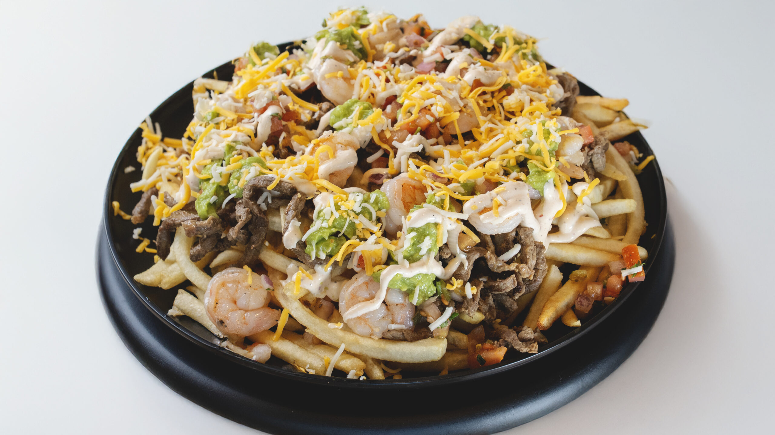 Marinated steak strips, grilled shrimp sautéed with pico de gallo, and topped with guacamole, creamy chipotle sauce & cheese.