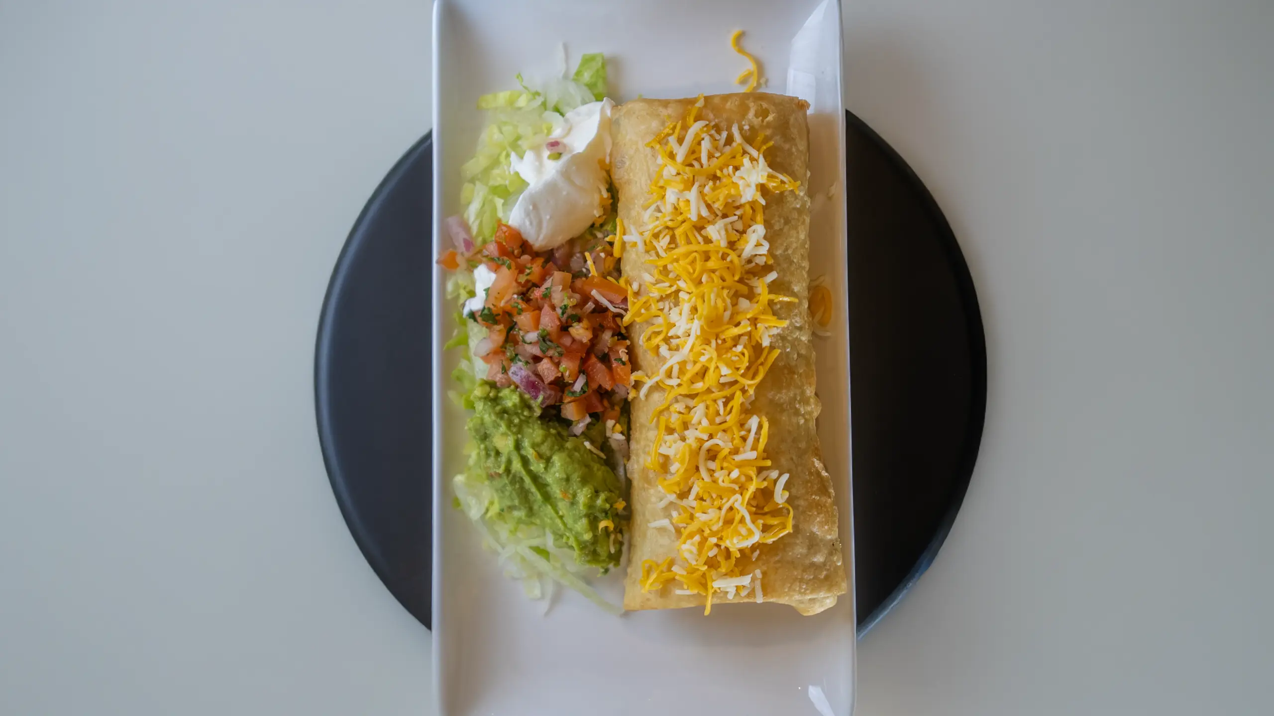 Filled with refried pinto beans, rice, fresh guacamole, sour cream, lettuce, cheese & pico de gallo.