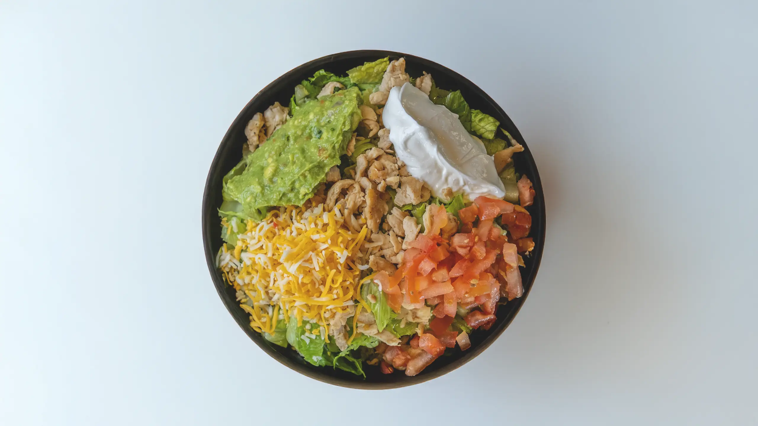 Our bowls are filled with crisp romaine lettuce, black beans, rice, tomato, guacamole, sour cream & shredded cheese.